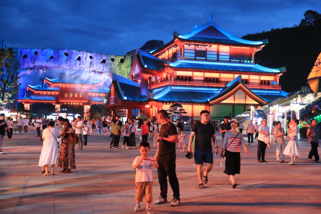 8月29日晚,在湖北十堰的“武当一梦”园区,游客们看完沉浸式表演后走出剧场。新华社记者龚兵 摄